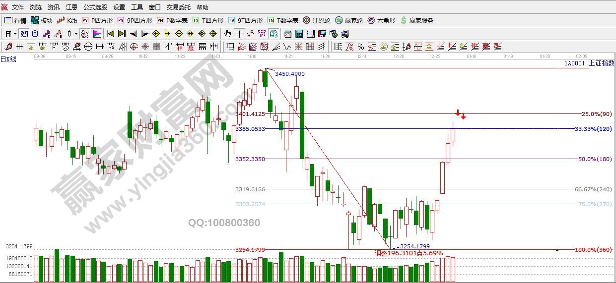 江恩看盤綜述:依據(jù)贏家江恩技術(shù)工具分析得出:周四,指數(shù)再創(chuàng)近期反彈新高,但市場(chǎng)展開(kāi)分化,在“兩桶油”的強(qiáng)拉升下,指數(shù)也呈現(xiàn)上漲乏力跡象。依據(jù)百分比分析,指數(shù)連續(xù)上攻已經(jīng)接近前期套牢區(qū),點(diǎn)位在3385--3400區(qū)間(百分比120度--90度之間),預(yù)計(jì)短期指數(shù)或?qū)_高回落,結(jié)束短期反彈走勢(shì),回調(diào)空間需要關(guān)注其力度和市場(chǎng)承接性,支撐關(guān)注日線生命線3345點(diǎn)附近。所以,不建議再次追進(jìn),同時(shí)逢高適當(dāng)減倉(cāng)下等待回落低吸良機(jī)。