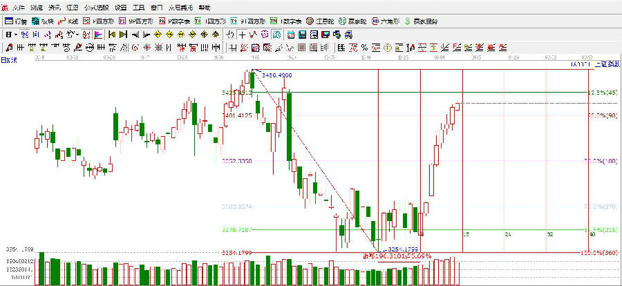 ★依據(jù)贏家江恩理論系統(tǒng)江恩波段百分比提示:滬指在創(chuàng)新高,全天在90度3401點(diǎn)之上震蕩整理,但量能同比縮小了。支撐依舊是3401點(diǎn),180度是3352點(diǎn)附近,上方目標(biāo)阻力在百分比45度3425點(diǎn)附近。