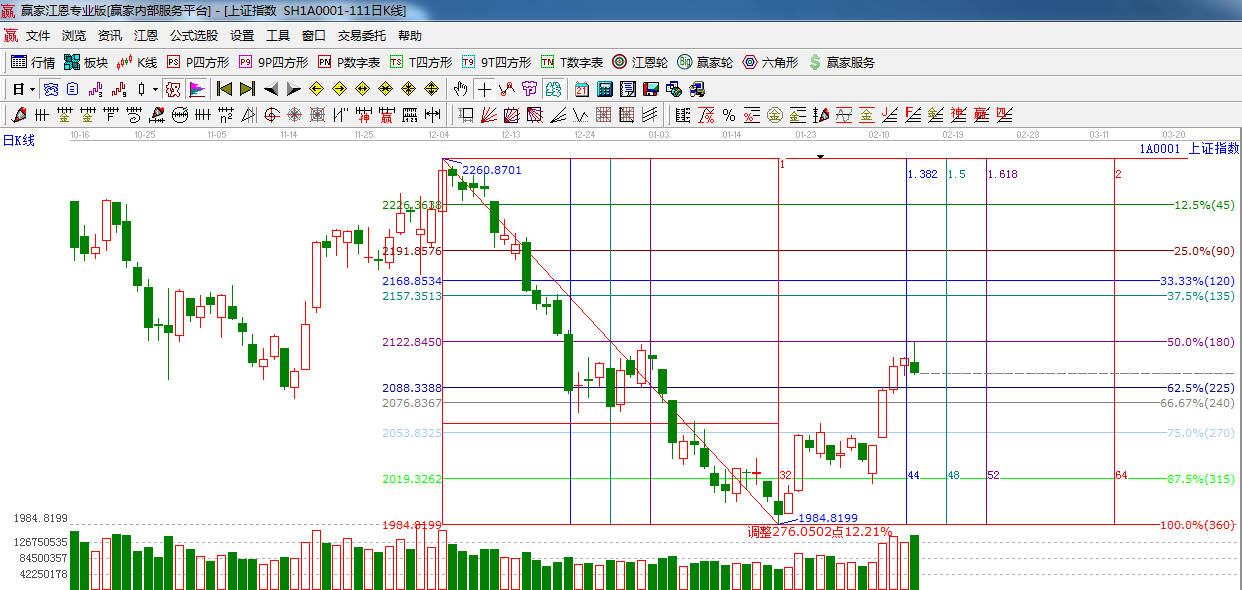 ☆ 依據(jù)贏家江恩系統(tǒng)波段百分比提示:早盤震蕩,午后在銀行的帶領(lǐng)下沖高,在昨天分析的270度位置遇阻后大幅回落,這個(gè)位置恰恰也是2260--1984點(diǎn)波段的180度強(qiáng)阻力位置(180度,2122點(diǎn),與今天指數(shù)最高點(diǎn)一點(diǎn)不差),明天關(guān)注江恩180度阻力2122點(diǎn),下方江恩支撐225度2088點(diǎn),240度2076點(diǎn)。