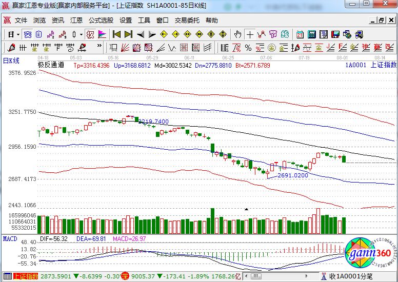 滬指跌1.81%,報2824點;深成指跌1.89%,報9005點;創(chuàng)業(yè)板指跌1.24%,報1542點。盤面上看,上海自貿港、航運等少數(shù)板塊上漲;深圳國資改革、鋼鐵、軍工、水泥、化工新材料、煤炭等板塊跌幅居前。滬股通凈流入5.6億,深股通凈流入5.5億。相應的極反通道指標的支撐壓力提示,如下圖所示: