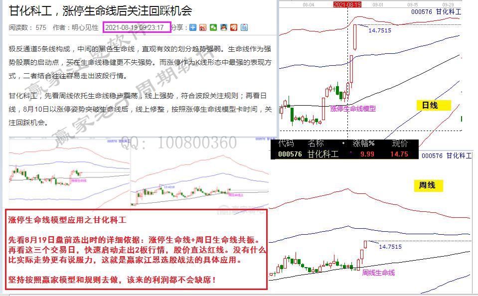 先看8月19日盤前選出時(shí)的詳細(xì)依據(jù):漲停生命線+周日生命線共振。再看這三個(gè)交易日,快速啟動(dòng)走出2板行情,股價(jià)直達(dá)紅線。沒有什么比實(shí)際走勢(shì)更有說服力,這就是贏家江恩選股戰(zhàn)法的具體應(yīng)用。堅(jiān)持按照贏家模型和規(guī)則去做,該來的利潤(rùn)都不會(huì)缺席!