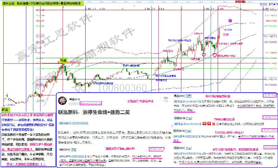 以聯(lián)泓新科上市的第一波上漲為歷史因子,作三步分析圖。跟隨圖中的標(biāo)注及相應(yīng)的解讀,可以發(fā)現(xiàn):期間幾乎重要的低點(diǎn)、高點(diǎn)均落在江恩線上。時(shí)價(jià)有序的律動(dòng),持股不動(dòng)已翻倍;在支撐低吸、壓力高拋,利潤(rùn)更佳。不多言看圖即可。