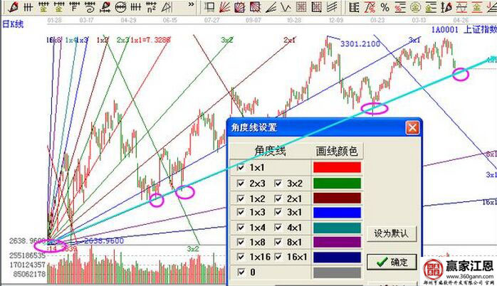 從上圖我們可以看到,指數(shù)是多次的沿著1*1角度線震蕩上行,而破了1*1角度線就跌至了3*2角度線而2638.30以來最重要的就是其4*1角度線,指數(shù)分別于160526日2780盤中精準(zhǔn)碰到開始上漲至2*1角度線,在160624再一次4*1角度線站穩(wěn)再次攻擊2*1角度線,角度線支撐壓力一覽無遺。當(dāng)然這個(gè)角度線是依據(jù)江恩理論來設(shè)計(jì)的,如若您想要學(xué)習(xí)江恩方面的知識,可以進(jìn)入江恩學(xué)院進(jìn)行系統(tǒng)的學(xué)習(xí)。