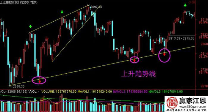 上圖是本人在2017年1月17日做所的一張上證指數(shù)圖,顯然上面就是一個(gè)非常明顯的上升趨勢線,就是以每一次的低點(diǎn)的連線來畫線,像上面那樣就是上升趨勢線,當(dāng)然相反的下降趨勢線就是以反彈的高點(diǎn)連線來做線,如果股價(jià)突破下降趨勢線,那么即意味著股價(jià)將會反轉(zhuǎn)。所以趨勢線就是相鄰兩個(gè)低點(diǎn)或者高點(diǎn)所構(gòu)成的直線射線延伸。顯然是不同與上面所講的江恩角度線的。