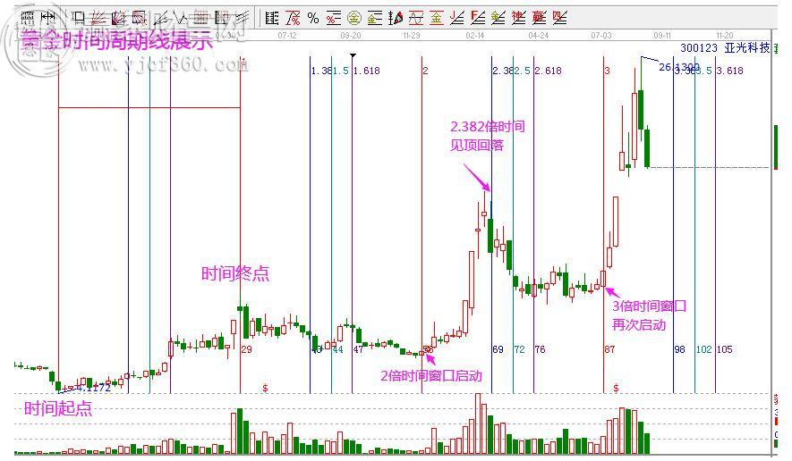 圖形解析:亞光科技,以2018年10月19日低點(diǎn)到2019年5月17日高點(diǎn)的周線為起始周期。同時(shí)保留最關(guān)鍵的0.382、0.5、0.618分割位??梢钥吹?,股價(jià)在2倍時(shí)間窗口啟動(dòng)拉升,在2.382倍時(shí)間窗口拐點(diǎn)向下,3倍時(shí)間窗口再次啟動(dòng)趨勢(shì)拉升行情。兩波大幅度上漲行情,都是出現(xiàn)在倍數(shù)位,可通過(guò)該工具完美把握。因此,接下來(lái)的4倍時(shí)間窗口就尤其關(guān)鍵了。