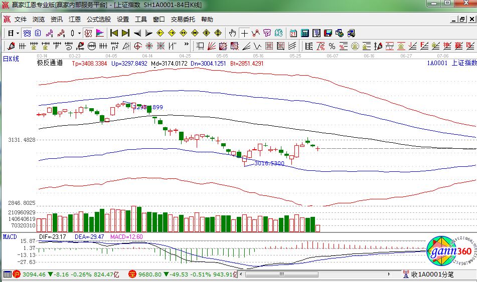 贏家江恩軟件是一款非常不錯(cuò)的股票分析系統(tǒng),特色極反通道指標(biāo)是一種萬能指標(biāo),對(duì)于長中短線以及波段操作者都是適用的,而且其中蘊(yùn)含著眾所哲學(xué)思想,是可以充分的顯示處股價(jià)趨勢(shì)的強(qiáng)弱的。如上圖,現(xiàn)在大盤正處在極反通道黑色生命線下方,顯然是處于弱勢(shì)的區(qū)域。
