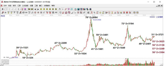 以上表格單數(shù)與雙數(shù)的平方,與滬指歷年來重要拐點(diǎn)均有著數(shù)字關(guān)系,其中有極度精準(zhǔn)的1849,也有略有差別的325、5178、3478、還有部分相差略大的,但整體也在50個點(diǎn)以內(nèi),如6124、2440、2245。