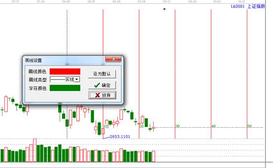 ? 畫線設(shè)置。系統(tǒng)默認的為紅色、實線、綠色字符。大家可以根據(jù)自己的喜好進行設(shè)置。將鼠標移動到所選的起點處,鼠標變成十字狀,點擊鼠標右鍵——編輯等距時間周期線,出現(xiàn)如下圖,進行設(shè)置即可。常用的設(shè)為默認。