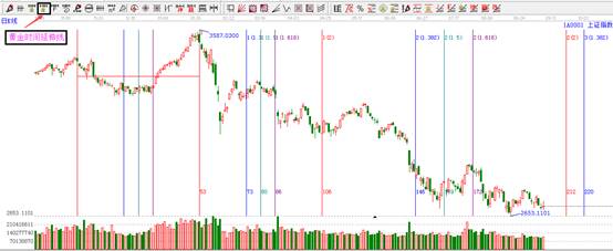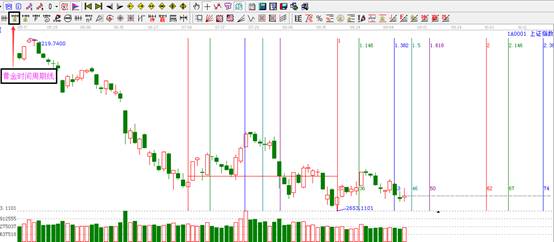 (三)實戰(zhàn)作用:依據(jù)工具所得出的豎線即為時間窗口,據(jù)此可提前預(yù)測指數(shù)和股價的上漲或下跌的時間周期,判斷可能發(fā)生趨勢反轉(zhuǎn)的時間點。