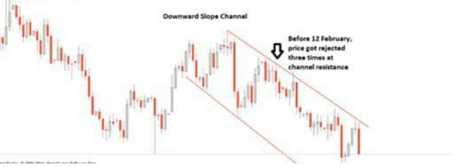 如果單獨(dú)的講解理論知識(shí)不方便大家的記憶,今天我們就通過美元瑞郎的實(shí)戰(zhàn)案例來進(jìn)行相關(guān)的介紹。首先我們?cè)谌誎線圖上繪制處趨勢(shì)線,顯示處該貨幣對(duì)下跌趨勢(shì)。通道進(jìn)一步顯示,當(dāng)時(shí)價(jià)格在通道阻力方面遭遇到了三次強(qiáng)壓制,如下圖所示。